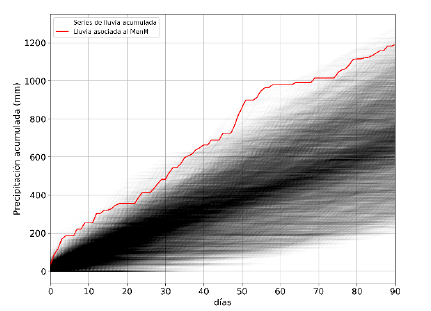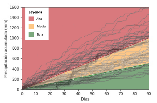 También se obtienen series gráficas de lluvia acumulada Antecedente Histórica (AH). Consisten en series de lluvia acumulada a 90 días para todos los días anteriores a la ocurrencia del movimiento en masa, hasta el 30 de marzo de 1990. Se seleccionó este día como nivel de referencia para garantizar que las series sean completas, ya que la fecha más antigua de registros de lluvia disponible es a partir del enero de 1990, de tal forma que sea posible observar el histórico de precipitación en la zona de ocurrencia de cada movimiento en masa reportado y contrastarlo con las condiciones particulares de las lluvias antecedentes desencadenantes. Al superponer las series gráficas de AD del movimiento en masa sobre las series de lluvia acumulada AH, se obtienen gráficas como la Figura 3D. Este procedimiento se realizó para los 100 registros de movimiento en masa reportados en las bases de datos. Estas gráficas, permiten realizar análisis de las condiciones de lluvia antecedente, de los tres últimos meses anteriores a la ocurrencia de movimientos en masa y su relación con las condiciones históricas de precipitación en la zona.