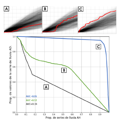 La curva tiene un área bajo la curva (AUC) mayor a medida que la proporción de series de lluvia AH se acerca a 1. Es decir, cuantas más series de lluvia AH son superadas en un número determinado de veces por la serie acumulada de lluvia AD mayor será el AUC. Por tanto, mayor será la tendencia de las condiciones de precipitación antecedente histórica a verse superadas por las condiciones de lluvia acumulada detonante de los movimientos en masa. Valores de AUC cercanos a 1 significan condiciones de lluvia extremas comparadas con las condiciones históricas.