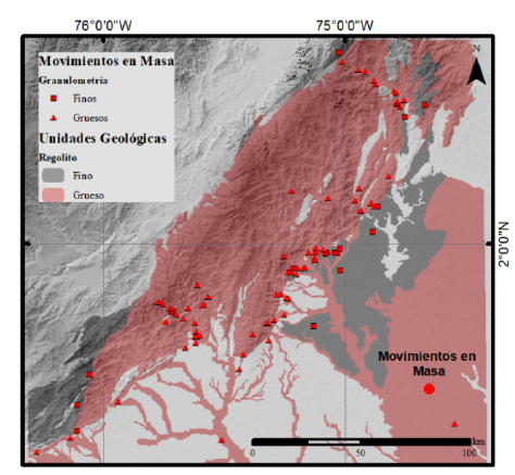 Por lo tanto, con el fin de determinar la relación que tiene la lluvia antecedente con las características granulométricas del material de las laderas en el piedemonte llanero, se clasificó el regolito producto de la meteorización de los cuerpos de roca de la región en suelos finos y suelos gruesos. Para ello, se clasifica a partir de las características texturales y mineralógicas descritas en la cartografía geológica realizada a escala 1:100.000 por el SGC, entre unidades con producción de regolitos fino-granulares y grueso-granulares (Figura 6).