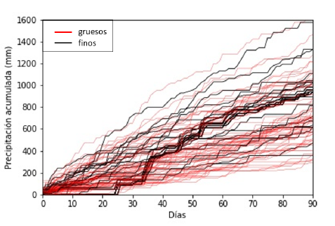 La Figura 7 presenta las curvas de lluvia antecedente de 90 días de los 100 registros de movimientos en masa, separados de acuerdo con el saprolito donde se presentó el evento. Se puede observar un claro patrón diferencial para los movimientos en masa en suelos gruesos y en suelos finos de acuerdo con la lluvia antecedente. Los eventos que se presentaron en suelos gruesos tienen curvas en la parte baja señalando que las condiciones de lluvia antecedente no fueron extraordinarias, con valores muy bajos de precipitación. Mientras que los movimientos en masa que ocurrieron en laderas conformadas por suelos finogranulares presentan curvas AD en la parte alta, indicando valores muy altos de precipitación acumulada.