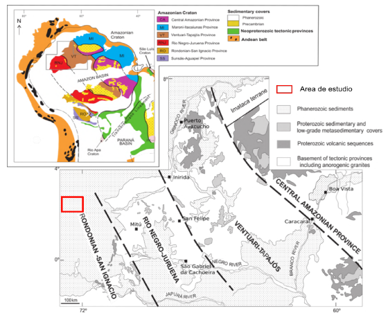 Esta unidad sedimentaria se encuentra localizada en una de las áreas cratónicas más grandes del mundo, el Cratón Amazónico (CA). Este cratón, en su mayor parte pertenece a Brasil y se extiende por el norte a Colombia, Venezuela, Guyana, Surinam y Guyana Francesa (Figura 1), y fue conformado durante los últimos 2700 millones de años (2,7 Ga) alrededor de núcleos arquéanos en Venezuela (Cinturón de Imataca, 2,74-2,63 Ga; Tassinari et al. (2004)), y en Brasil (Cinturón de Amapá, 2,65-2,60 Ga; Rosa-Costa et al. (2003)). Actualmente, se limita al oriente por el Cinturón Móvil Araguaia de edad Neoproterozoico, y al occidente por la cadena montañosa de los Andes. En Colombia, aflora el extremo noroccidental del CA, representado por la Provincia Geocronológica Rio Negro-Juruena, con edades entre 1,81-1,55 Ga (Tassinari y Macambira, 1999), y un cinturón llamado Orógeno Putumayo (Ibáñez-Mejía et al., 2015), el cual es correlacionable con la Provincia Geocronológica Sunsás (1,25-1,0 Ga) y cuyos relictos afloran también a lo largo de los Andes como ventanas del basamento. Posiblemente, debido a una extensa cobertera sedimentaria Fanerozoica y vegetación selvática en territorio colombiano, no se ha identificado la existencia de otras provincias descritas en el suroccidente del Cratón Amazónico como la Provincia Rondonia-San Ignacio (1,5-1,3 Ga; Tassinari y Macambira, 1999).