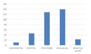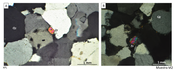 Adicional al cuarzo monocristalino, se observó alrededor del 5% de cuarzo policristalino con contactos suturados, de los cuales se presume una procedencia metamórfica, de acuerdo con Ulmer-Scholle etal. (2014). El sedimento se encuentra en un estado de madurez textural III, según Ulmer-Scholle et al. (2014), dado que no fue observada una cantidad apreciable de arcilla, y se evidenció un 49% de granos muy bien redondeados con un porcentaje similar de granos con alta esfericidad.
