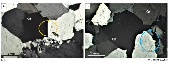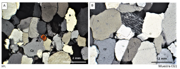 Cuarzoarenita (muestra CG50) localidad de Cerro Azul piso 2: Corresponde a una cuarzoarenita de grano grueso a muy grueso con cristales que alcanzan hasta los 2.5 mm de longitud. Presenta cuarzo, feldespato, circón, moscovita, opacos y líticos de cuarcitas. En general, no presenta estructuras internas. Contactos completos y rectos en ocasiones suturados, cemento silicio uniendo los cristales e intercrecimiento de granos de cuarzo por alta diagénesis (Figura 11).