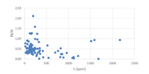 Los circones tienen longitudes entre 60 y 1000 um (Figura 12). En general los bordes están redondeados, ya no reflejan la forma del cristal original magmático o metamórfico, lo que confirma su abrasión durante el transporte, junto con los granos de cuarzo, antes de formar parte de las cuarzoarenitas. Una gran parte de los circones es isométrica, sea por crecimiento o por abrasión, mientras otros muestran ejes alargados paralelos a c con relaciones 4:1 a 2:1 (Figura 13-2, 1311, 13-22, 13-23). Algunos tienen forma bipiramidal, otros dejan ver diferentes zonas o fracturas. En imágenes de cátodoluminiscencia (Figura 12C) se evidencian los diferentes pulsos de crecimiento de los circones, mejor representado cuanto más antiguo sea el núcleo y más joven el borde. La zonación fina oscilante es típica de crecimiento a partir de magmas (Corfu et al., 2003), áreas más homogéneas probablemente han recibido reorganización cristalina por metamorfismo, que en algunos casos también indujo crecimiento de nuevos bordes. Los contenidos de uranio (U) medidos por LA-ICP-MS varían entre 23 y 2170 ppm, con mayor frecuencia debajo de 500 ppm, de plomo (Pb) entre 11 y 1886 ppm y de torio (Th) entre 5 y 2000 ppm. La relación Th/U vs U tiene una cierta dispersión, pero se concentra en valores Th/U menores de 1 (Figura 14 y Anexo A). Las edades calculadas indican picos entre 1000 y 1800 Ma (Figura 15).