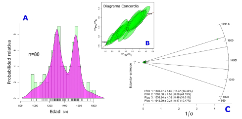 Para los circones analizados de las areniscas de la Formación San José fueron identificados dos picos principales con edades aproximadas de 1310 y 1540 Ma. Los resultados en el gráfico de estandarización estimada permitieron definir la probabilidad de mayor concentración de las edades diferenciadas en 4 picos: el principal de 1306+4 Ma, donde se concentra el 44% de los datos, seguido de 1536+4 Ma con el 31% y en menor proporción un pico 1105+6 Ma con el 15% y otro de 1643+22 Ma que acumula el 10% de los datos obtenidos (Figura 15).