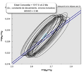 Los circones obtenidos de neises del basamento Proterozoico de la vereda Jordán Alto-El Capricho, son prismáticos a subhedrales, con tamaños entre 300 y 100 μm; la mayoría presentan algunas estructuras núcleo-manto con anillos concéntricos e inclusiones de otros minerales. Sus relaciones isotópicas bastante homogéneas permitieron calcular una edad concordante de 1317+4 Ma (MSWD = 0,96) (Figura 16), interpretada como la edad pico del metamorfismo que afecta el protolito.