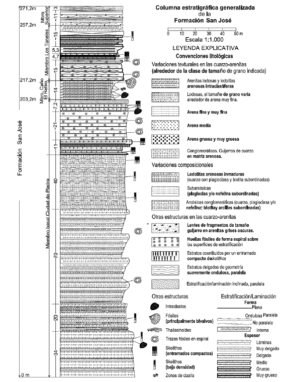 Corresponde a una secuencia sedimentaria que aflora en la Serranía La Lindosa, dentro de la plancha 350-San José, al suroccidente del centro poblado de San José del Guaviare. Fue definida por Trumpy (1943) como una sucesión sedimentaria de areniscas, posiblemente de edad Cretácica Inferior, que están expuestas en cercanías de la ciudad de San José del Guaviare. Arango et al. (2011) establecen que la Formación San José podría ser de edad Cretácica por una asociación de fósiles encontrados en el sitio Las Brisas, de especímenes como Tellina? sp. inc., Crasatella? sp. inc., Cardita? sp. inc., Toquesia? sp. inc., Nuculana? sp. inc., Crasatella? sp. inc., Lima? sp. inc., y Bivalvia? gen et sp. inc. Los ejemplares fueron asociados a especies del Cretácico colombiano, pero por su mal estado de conservación no se concluye de manera tajante su edad. Por su parte, la Formación de San José se subdivide de base a tope (Figura 3) en cuatro miembros: el Miembro Basal Ciudad de Piedra (objeto de estudio); el Miembro Caño El Retiro compuesto de lodolitas abigarradas de tonos violetas a amarillos y lodolitas arenosas a arenitas lodosas; el Miembro Los Túneles que se compone principalmente de cuarzo arenitas con bioturbación por Thalassinoides y el Miembro Superior, compuesto por cuarzo-arenitas blancas a beige de grano fino a medio, y con estratificación laminada, masiva y/o bioturbadas por Thalassinoides (Arango et al., 2011) (Figura 3).