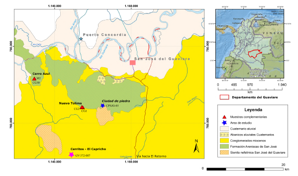 El área de estudio se encuentra cubierta por sedimentos cuaternarios pertenecientes a la Cuenca de los Llanos Orientales. Sedimentos más antiguos como arcillas grises moteadas y abigarradas son asignados a la Formación Caja, probablemente del periodo Neógeno y correlacionable con la Formación Guayabo aflorante en el área del Catatumbo, que infrayacen los sedimentos cuaternarios (Bayona et al., 2008). En contacto con las rocas sedimentarias del Cenozoico sobresalen las areniscas, probablemente Cretácicas, de la Formación San José (Arango et al., 2011), en las cuales se ha modelado la Ciudad de Piedra. Al sur del área de estudio afloran las rocas plutónicas de la Sienita Nefelínica de San José del Guaviare (SNSJG), emplazadas a finales del Precámbrico durante el Ediacárico (Arango-Mejía et al., 2012; Muñoz-Rocha et al., 2019) en el basamento metamórfico que aflora cerca del área de estudio, lo que ha nombrado el Servicio Geológico Colombiano (SGC) como Complejo Guaviare (Maya-Sánchez et al., 2018; Amaya-López et al., 2020).