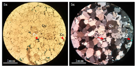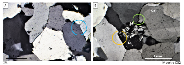Ciudad de Piedra: en la sección delgada de la muestra CPSJG-03 se determinó un tamaño de grano arena gruesa a media (Figura 6) con 93% de cuarzo monocristalino, en su mayoría, alrededor de un 6% de porosidad y menos del 1% de minerales accesorios como circón o/y apatito de formas euhedrales con prismas alargados (Figura 7). Exhibe mayoritariamente dos poblaciones de granos de cuarzo: la primera monocristalina con esfericidad buena y alta redondez y la segunda con baja esfericidad, buena redondez y extinción ondulante; ambas de tamaño predominantemente arena media y gruesa, con cemento silíceo en sobrecrecimiento de granos de cuarzo, así como bahías de corrosión. La muestra corresponde a una cuarzoarenita de grano medio a grueso moderadamente bien seleccionada según Nichols (2009).