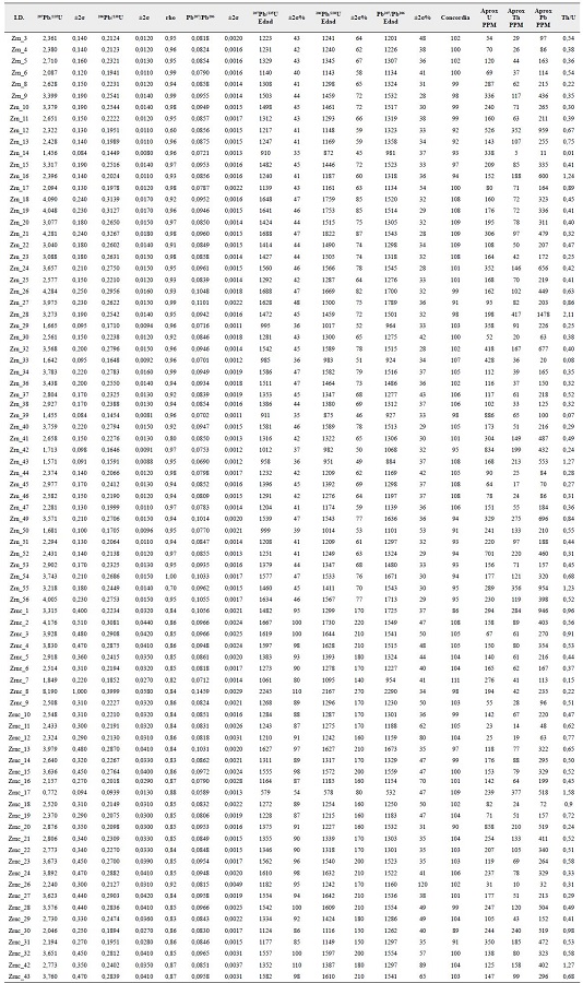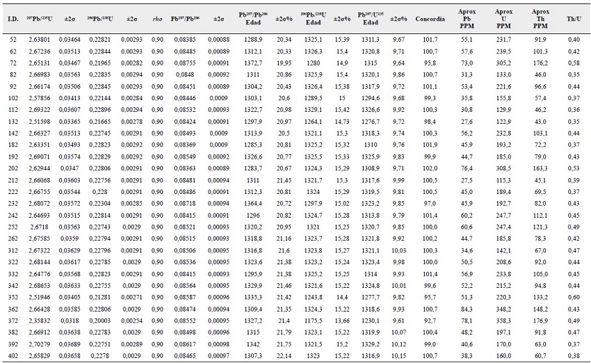 Los análisis isotópicos usando ablación láser en un equipo de espectrometría de masas por plasma acoplado inductivamente (LA-ICP-MS) fueron realizados en los Laboratorios de la Universidad de Rennes 1, en Francia, utilizando un LA-ICP-MS Agilent 7700x equipado con un sistema de bombeo dual para aumentar la sensibilidad. El sistema Excimer 193 nm ESI (NWR193UC) produce un láser coherente con duración de impulsos ultracorta (<5 ns) y una célula de ablación con dos volúmenes Truline que tiene una duración de "wash-out" de menos de 0,2 segundos, completamente controlado por ordenador, según el procedimiento descrito por Bühn etal. (2009). Debido al tamaño de los cristales, la ablación de los granos con láser fue realizada en spots de 25 μm, utilizando una frecuencia de 4-5 Hz e intensidad de 9 J/cm2. El material evaporado fue cargado por un flujo de He (~0,40 L/min) y Ar (~0,90 L/min). En todos los análisis se utilizaron los patrones del estándar, por cada ocho mediciones en circones, se realizó una en el material de referencia GJ-1 (GEMOC ARC National Key Center, Jackson etal., 2004) para la corrección de la deriva del equipo, así como para el fraccionamiento entre los isótopos de U y Pb (Jackson et al., 2004). Las incertidumbres asociadas a las razones presentadas en el Anexo A y B son de 2σ, en porcentaje. Las edades fueron calculadas utilizando ISOPLOT 3.0 (Ludwig, 2003) y los diagramas (95% de confianza) fueron confeccionados en el mismo programa. Para el estándar Plesoviche, la edad concordia calculada fue de 334±6 Ma.