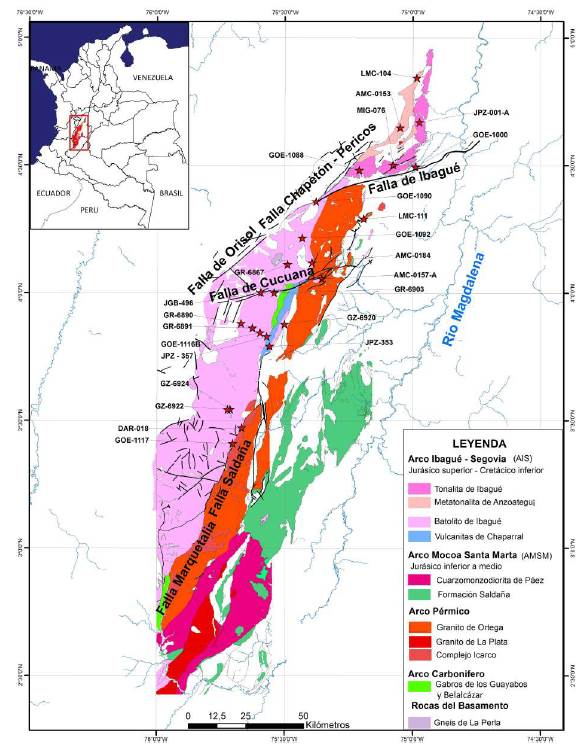 El basamento Neo-proterozoico, en la margen andina, fue cubierto por secuencias sedimentarias marinas paleozoicas, intruído por plutones formados por la subducción de la placa oceánica del paleo-Pacífico durante el Carbonífero (Leal-Mejía, 2011; Rodríguez-García et al., 2019), el Pérmico (Rodríguez-García et al., 2019) y el Jurásico temprano a medio (Leal-Mejía et al., 2019; Bayona et al., 2020; López-Isaza y Zuluaga, 2020; Rodríguez-García et al., 2020a, 2020b). Posterior a la intrusión de plutones durante el Carbonífero y el Pérmico, se dio una reactivación magmática corta a principios del Triásico que intruyó los plutones pérmicos (Rodríguez-García et al., 2022; Zapata-Villada et al., 2022), seguida por la formación de secuencias sedimentarias locales continentales y marinas (formaciones Luisa, Payandé y Los Indios) que se depositaron durante el Triásico sobre los plutones pérmicos ( Núñez y Murillo, 1982). Luego, se desarrolló un nuevo arco en la margen continental, al oriente de los plutones carboníferos y pérmicos, durante el Jurásico temprano y medio, que duró activo ~30 Ma (197-167 Ma) (Figura 1, Rodríguez-García et al., 2017b, 2020a, 2020b).