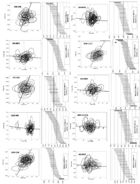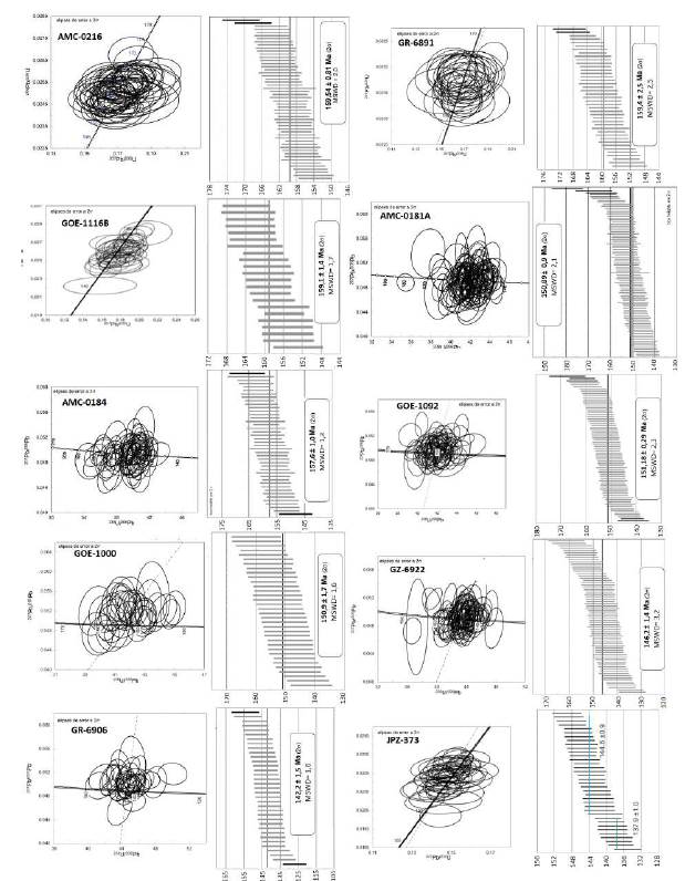 En las Figuras 9 y 10 se muestran los diagramas Tera-Wasserburg, Wetherill y la edad promedio ponderada de las muestras datadas. La localización espacial se presenta en las Figura 1 y 3. El cálculo de la edad promedio ponderada de las muestras GOE-1117, JPZ-353, DAR-018, GOE-1116B, GR-6891, AMC-0216, GR-6890, GR-6867, GZ-6920, JGB-396, GOE-999, GOE-1000, AMC-0181A, AMC-0184, GOE-1090, GOE-1092 se realizó a partir de edades con discordancias <10% y error <5%; mientras que para las muestras GR-6903, GR-6906, JPZ-373, GZ-6922, AMC-0157A, se hizo un filtro de los datos para descartar los circones con discordancias >5% y errores >5% (Tabla Suplementaria S2).