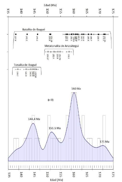 La Figura 11 resume las edades del batolito de Ibagué, la Metatonalita de Anzoátegui y la Tonalita de Ibagué. El batolito de Ibagué tiene un pico de cristalización a -160 Ma y un pico discreto a 171 Ma, la Metatonalita de Anzoátegui presenta un pico de cristalización -151,5 Ma y la Tonalita de Ibagué presenta dos picos de cristalización a -145 Ma y -138 Ma. Los resultados sugieren que el batolito de Ibagué cristalizó primero que la Metatonalita de Anzoátegui y la Tonalita de Ibagué, presenta mayor variación litológica (Figura 6) y el magmatismo se desarrolló en un rango de tiempo más amplio, con algunas rocas que cristalizaron al mismo tiempo que cristalizaban la Metatonalita de Anzoátegui y la Tonalita de Ibagué.