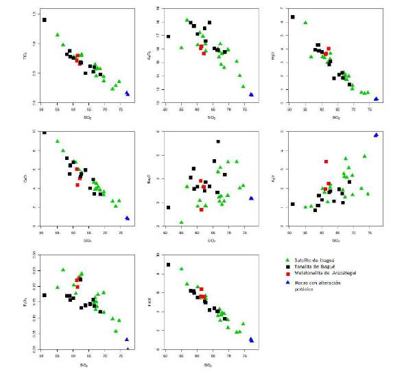 En el diagrama de Harker (Figuras 12), los valores de TiO2, Al2O3, Fe2O3, MgO, MnO, P2O5 y CaO para el batolito de Ibagué, la Metatonalita de Anzoátegui y la Tonalita de Ibagué disminuyen con el aumento de SiO2. El Na2O, en los tres plutones, muestra dispersión y es relativamente constante, y el K2O también exhibe dispersión, pero aumenta cuando lo hace el SiO2 o cuando las rocas tienen alteración potásica (en azul) (Figuras 12).