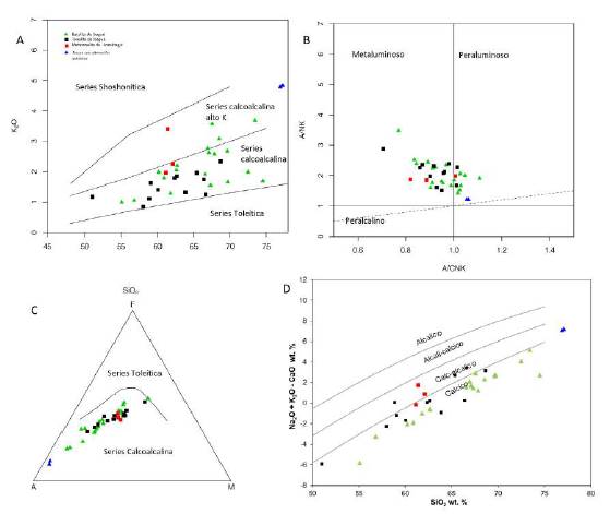 Los granitoides de la Metatonalita de Anzoátegui y la Tonalita de Ibagué y la mayoría de las rocas del batolito de Ibagué son calco-alcalinos, pero algunos alcanzan el campo calco-alcalino alto en K en el batolito de Ibagué (Figura 13A). Las muestras MGOQ-007 y GR-6903, del batolito de Ibagué, tienen alteración hidrotermal potásica de acuerdo al análisis químico de alteración y a la formación de biotita hidrotermal descrita en el análisis petrogáfico; estas rocas están dentro del campo calco-alcalino alto en K, lo que sugiere que los mayores contenidos de K2O y SiO2 se deben a adición por alteración (Figura 13A).