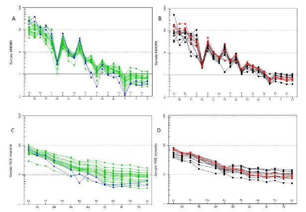 Elementos trazas: el batolito de Ibagué, la Tonalita de Anzoátegui y la Tonalita de Ibagué en el diagrama de los elementos trazas normalizados al NMORB tienen anomalía negativa de Nb, Ti y P; anomalía positiva y valores altos de Cs, Ba, Th, Sr, K, Ba, Pb y Rb, comparables con los patrones de arcos magmáticos (Pearce, 1996), con empobrecimiento progresivo de los elementos de radio iónico grande hacia los elementos de radio iónico pequeño (Figura 14A, 14B). El batolito de Ibagué muestra mayor anomalía negativa de Ti con valores normalizados de TiN entre 0,11 y 0,91, mientras las rocas de la Metatonalita de Anzoátegui y la Tonalita de Ibagué tienen valores de TiN entre 0,38 y 1,11. Los patrones de tierras raras normalizados al condrito según los valores de Nakamura (1974), son subparalelos en ambos bloques, con pendiente negativa y patrones comparables al de rocas generadas en ambientes de subducción por encima de la placa subducida (Pearce et al., 1984), con enriquecimiento en tierras raras livianas y empobrecimiento hacia las tierras raras pesadas (Figura 14C, 14D). Presentan en general anomalía negativa de Eu, con relaciones Eu/Eu* variables entre 0,4 y 1,22 (Tabla Suplementaria S2).