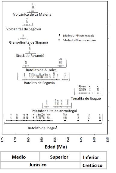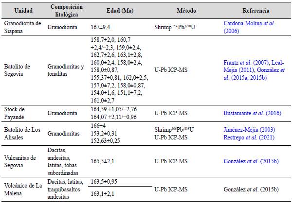 Spikings et al. (2015) consideraron el conjunto de plutones jurásicos como un evento magmático, con migración y rejuvenecimiento del magmatismo en sentido este-oeste, idea que comparten otros investigadores (Bayona et al., 2010; Bustamante et al., 2016; Quandt et al., 2018; Leal-Mejía et al., 2019; López-Isaza y Zuluaga, 2020; Restrepo et al., 2021). Posteriormente, Leal-Mejía et al. (2019) reconocieron en el magmatismo Triásico Jurásico del norte de los Andes cuatro rangos de edad distintos en por lo menos seis segmentos de arco separados, y describieron la similitud temporal de los batolitos de Ibagué y Segovia, considerándolos como parte de un mismo episodio de magmatismo que ocurrió entre 165 y 152 Ma, pero no separaron este arco del evento magmático del Jurásico temprano a medio que formó el AMSM.