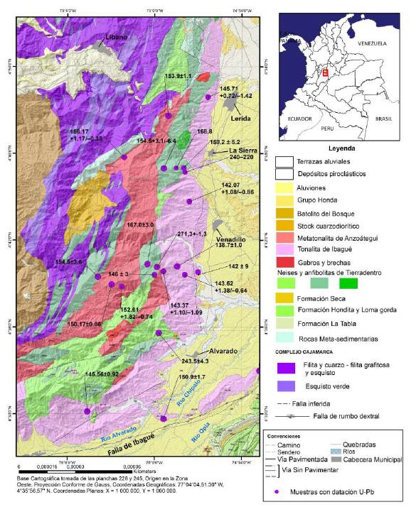 El batolito de Ibagué redefinido se extiende a lo largo del flanco oriental de la cordillera Central desde la falla de Ibagué al norte, hasta el páramo de Las Hermosas al sur; aflora en superficie como un cuerpo con una longitud aproximada de 180 km y un ancho promedio de 20 a 30 km (Figura 1 y 3). Al occidente está en contacto intrusivo y fallado con rocas metamórficas del Complejo Cajamarca, y al oriente intruye el Granito de Ortega. Al interior del plutón se presentan techos colgantes de neises y esquistos, con edades jurásicas, triásicas y ordovícicas. Las edades de cristalización del batolito de Ibagué redefinido varían entre 171,5±1,3 Ma y 137,9±1,0 Ma, con un máximo de actividad magmática alrededor de 160 Ma (Figura 11).