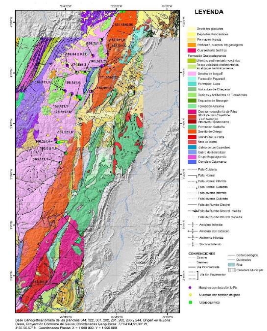 Al Servicio Geológico Colombiano que financió el estudio. A los laboratorios de química, elaboración de secciones delgadas y geocronología del Servicio Geológico Colombiano, a los geólogos Gilberto Zapata, Tomas Correa, Lina Cétina y José Gilberto Bermúdez por su ayuda con el muestreo de campo. A Alberto Núñez por la revisión del articulo, a Diego Morata por los comentarios para mejorar la discusión y al revisor anónimo por sus comentarios, que influyeron en la mejora del manuscrito.