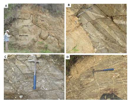 La Metatonalita de Anzoategui es un cuerpo ígneo deformado que intruye la unidad de Neises y anfibolitas de Tierradentro y hacia los bordes del cuerpo presenta xenolitos de neises y anfibolitas (Figura 4A); además, intruye cuerpos pequeños de gabro. Presenta orientación mineralógica y desarrolla estructura foliada en ciertas partes del cuerpo (Figura 4B, 4C), con rumbo N-S a N-NE y buzamiento regional hacia el este o el oeste, muy similar a la foliación de los Neises y anfibolitas de Tierradentro. Adicionalmente, se observa una variación gradual de la estructura de las rocas, asociada a un aumento del grado de metamorfismo en está unidad. Las rocas se presentan con estructura ígnea orientada de color blanco con negro y de grano medio, pasando por una roca con estructura néisica y tamaño de grano medio, hasta rocas con estructura migmatítica (Figura 4B y 4D), con desarrollo de bandas oscuras que tienen mayor contenido de hornblenda y biotita, y bandas claras con mayor contenido de cuarzo y feldespatos; además, presenta localmente pliegues y diques deformados y foliados aplíticos, andesíticos y dacíticos (Figura 4A, 4B y 4D, vía Alvarado - vereda El Brillante).