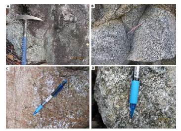 Al sur de la falla de Ibagué, el batolito de Ibagué está constituido por granodioritas, tonalitas y granitos rosados y blancos moteados de negro principalmente (Figura 5C), faneríticos de grano medio, con textura isotrópicas granulares y localmente por tonalitas con orientación mineral; estas últimas cerca del contacto occidental del plutón y cerca de los contactos con techos colgantes de la unidad Neises y anfibolitas de Tierradentro (vía a San Antonio de Las Hermosas) (Figura 5D).