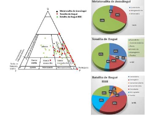 En la Tabla Suplementaria S1 se resumen los resultados petrográficos de la Tonalita de Ibagué, la Metatonalita de Anzoátegui y el batolito de Ibagué, a partir de 130 secciones delgadas; en la Figura 6, se presentan los resultados de la clasificación petrográfica de la Metatonalita de Anzoátegui, la Tonalita de Ibagué y el batolito de Ibagué.