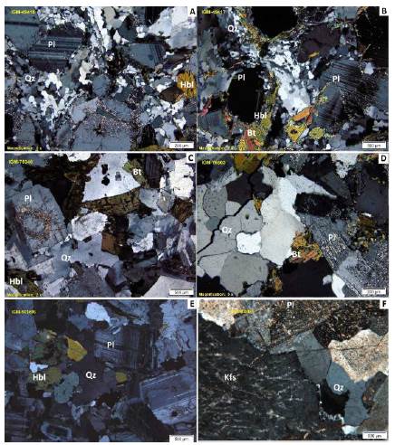 En el batolito de Ibagué las muestras fueron clasificadas como tonalitas (10), granodioritas (17), monzogranitos (8), cuarzomonzodioritas (4), monzonitas (3), cuarzodioritas (2), sienogranito (1) y cuarzogabro (1). Las rocas son faneríticas de grano medio con texturas granulares a inequigranulares, están constituidas por cuarzo anhedral de tamaños entre 1 y 2 mm, en cristales irregulares, con extinción ondulatoria. La plagioclasa es de tipo oligoclasa a andesina, en cristales euhedrales a subhedrales de forma tabular corta, con maclas de albita, albita-Carlsbad y periclina, pueden tener extinción zonada oscilatoria a normal. El feldespato alcalino es ortosa, de tamaños entre 0,3 y 3 mm, anhedral, empolvado por alteración a arcilla, con desmezclas pertíticas. La biotita se presenta en láminas euhedrales a subhedrales formando agrupaciones de cristales. La hornblenda puede o no estar presente en todos los litotipos, es euhedral a subhedral, inequigranular, de tamaños entre 300 um y 3 mm, de color verde pálido a verde oliva, pleocroica (Figura 7E y 7F). Como minerales accesorios se presentan titanita, opacos, circón, apatito y ocasionalmente allanita.