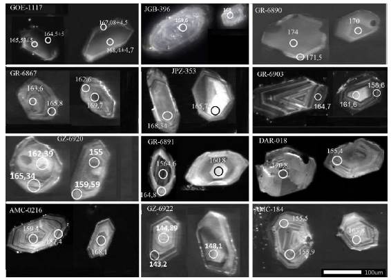Se realizaron 20 nuevas dataciones U-Pb LA-ICP-MS en circones del batolito de Ibagué y se recopilaron las edades U-Pb de la Metatonalita de Anzoátegui y la Tonalita de Ibagué (Tabla 1). Las imágenes de catodoluminiscencia de algunos circones datados se muestran en la Figura 8. Los circones son prismáticos cortos y en algunas rocas se presentan prismáticos alargados en forma de tallos, de tamaños entre 50 y 160 μm, tienen estructura concéntrica, con núcleo homogéneo de color gris y bordes zonados; en algunas rocas los circones tienen zonación oscilatoria bien desarrollada, con luminiscencia en diferentes tonos de gris. Las ablaciones se hicieron principalmente en los núcleos de los cristales y en algunos cristales en núcleo y borde. Son escasos los circones con núcleos heredados de circones más antiguos y bordes cristalizados correspondientes al evento ígneo jurásico.