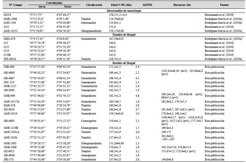 Para el batolito de Ibagué el rango de edades varía de 171,5±1,3 a 137,9±1,0 Ma, y la mayoría de edades son anteriores a 160 Ma, sin que se dé una distribución de edades por tipo de roca. La Metatonalita de Anzoátegui presenta edades de cristalización U-Pb entre 158,2 +1,2/-0,4 y 150,17±0,86 Ma (Bustamante et al., 2016; Rodríguez-García et al., 2020a); la Tonalita de Ibagué presenta edades más jóvenes de cristalización entre 145,71+0,72/-1,42 Ma y 138,48±0,95 Ma (Bustamante et al., 2016; Rodríguez-García et al., 2020a). La cristalización inicia en el batolito de Ibagué antes que en la Metatonalita de Anzoátegui y la Tonalita de Ibagué, con un rango de edades de cristalización de las tres unidades de alrededor de -34 Ma (Tabla 1).