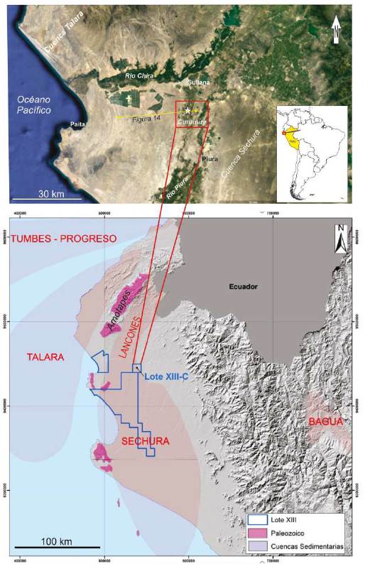 La cuenca Sechura se encuentra ubicada en el Noroeste del Perú extendiéndose sobre la costa del Departamento de Piura (Figura 1). Hacia el oeste, la cuenca Sechura está separada de la cuenca Talara por la Cordillera de la Costa (Macizo de Illescas - Alto de Paita - Montanas de la Brea y Amotapes), en tanto que su margen oriental está limitado por la Cordillera Occidental de los Andes (Higley, 2004). Sin embargo, la cuenca Sechura no siempre estuvo aislada de las cuencas cercanas. La actividad intermitente a lo largo de las fallas normales que dominaron los altos estructurales de basamento pudo haber controlado interacciones entre las cuencas Sechura, Talara, Lancones y Trujillo (Dunbar et al., 1990). Este comportamiento se refleja en su límite norte, donde nuevos datos del pozo Curumuy 1X modificarían la extensión de la cuenca.