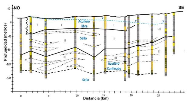 Nivel hidrogeológico III: considerado un acuífero confinado inferior que se encuentra a una profundidad aproximada de 80 a 95 m desde la superficie y actualmente por su calidad de agua dulce adquiere importancia (Tabla 2).