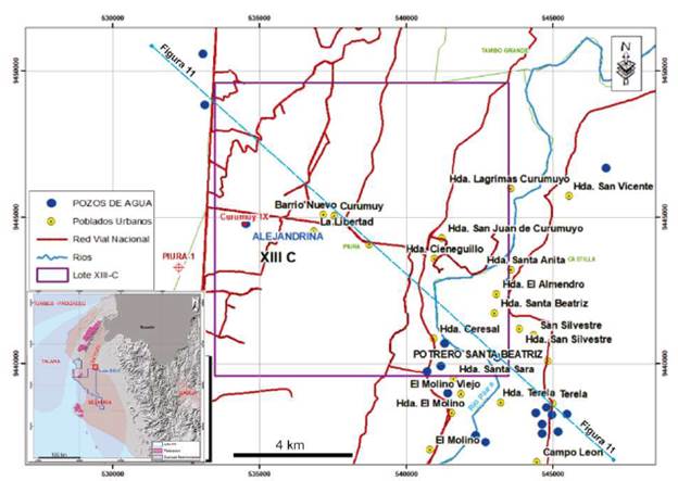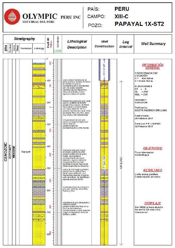 Con la finalidad de estudiar las características del subsuelo afectado por el problema suscitado por el pozo Alejandrina y las actividades para mitigarlo se realizó una síntesis de las características geológicas e hidrogeológicas vinculadas con el sector Curumuy. Además, se llevaron a cabo actividades típicamente relacionadas con la investigación del subsuelo a partir de la información provista por los pozos Papayal y Curumuy 1X y la interpretación de secciones sísmicas 2D en tiempo en plataformas georreferenciadas. Los intervalos perforados por estos pozos fueron perfilados a hoyo abierto por la empresa Schlumberger que incluía los perfiles del triple combo, sónico y finalmente de presión de formaciones (XPT). Seguidamente, se perforó con dos brocas PDC la sección de 25,8 m, alcanzándose el 23 de agosto a las 21:15 hs la profundidad final de 1419,75 m atravesando más de 137 m dentro de rocas paleozoicas del Grupo Amotape.
