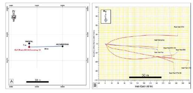 Se empezó a perforar el pozo verticalmente en modo rotario con broca tricónica de 8,5 pulgadas, hasta la profundidad de 30,5 m. Se guio la dirección del pozo hacia el Este en dirección de la ubicación del pozo Alejandrina en superficie, una vez alcanzado el nivel de arenas muy bien seleccionadas se empezó a navegar horizontalmente con ayuda del motor de fondo. Para ello se utilizó el sistema anticolisión para detectar la tubería de perforación que se encontraba atrapada en el pozo Alejandrina. Se realizaron sucesivas maniobras de cementación y apertura de nuevos huecos (Figura 12). Finalmente, luego de 5 intentos de conexión que consistieron en la perforación de tramos dirigidos horizontales (side track) a partir del mismo emplazamiento del pozo Papayal se logró establecer contacto con el pozo Alejandrina al identificarse la captación de un significativo nivel de flujo.
