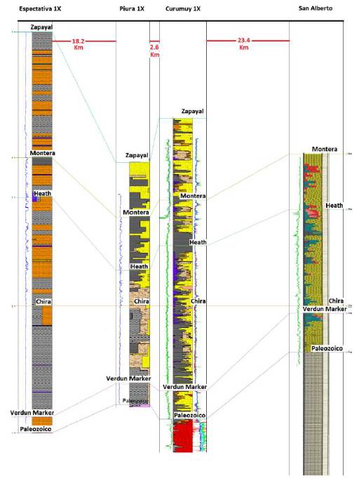 La columna sedimentaria atravesada por el pozo Curumuy 1X, y en parte por el pozo Alejandrina, evidencia varios nuevos reservorios potenciales que abrirían un nuevo frente exploratorio en este límite de las cuencas Sechura y Lancones (Figura 9).