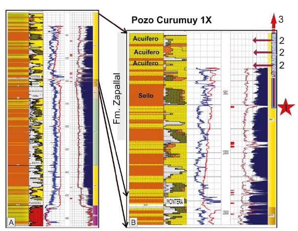 La Formación Zapallal presenta la distribución inicial en los reservorios identificados como niveles de acuíferos hacia la superficie y hasta 9 niveles de arenas como reservorios de gas hacia la base y el tope de la Formación Montera, identificados por cromatografía de gases y registros de Densidad-Neutrón (Figura 15B).