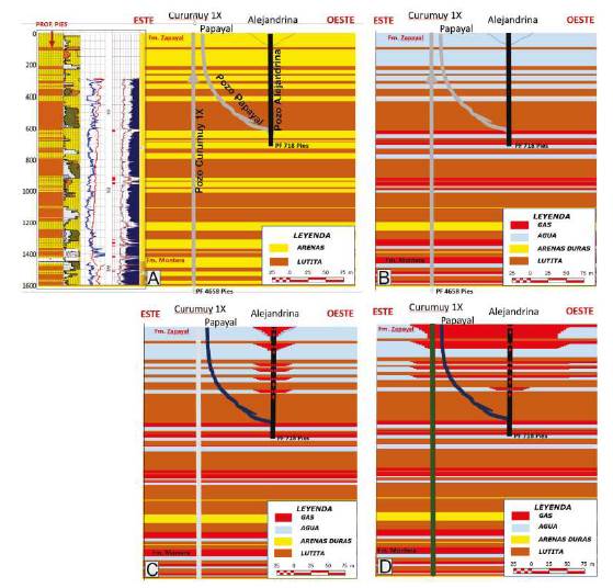 Un modelo simulado de la carga de gas hacia los niveles superficiales muestra los eventos progresivos producidos por la sucesión de los pozos Alejandrina, Papayal y Curumuy 1X (Figura 15).