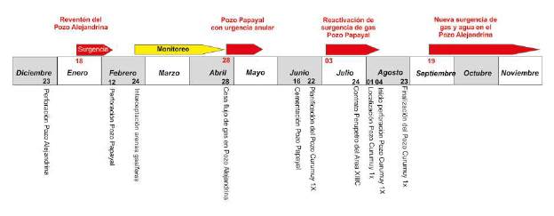 Inicialmente, con el objetivo de controlar la surgencia del pozo Alejandrina se perforó el pozo de alivio Papayal direccional para interceptarlo y captar el flujo descontrolado de gas y agua (Figura 11).