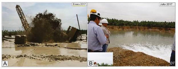 El 16 de junio del 2017 el pozo Papayal fue cementado de acuerdo con la legislación peruana vigente. Luego de unos días, durante el monitoreo constante que se venía siguiendo, se evidenció presencia de humedad en el suelo alrededor del pozo Alejandrina, posteriormente el cráter comenzó a llenarse de agua y se reactivó la surgencia de gas en el área por el pozo Alejandrina (Figura 3B).