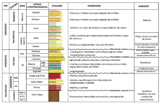 La constitución estratigráfica del sector estudiado Curumuy de la cuenca Sechura está representada a partir de la información obtenida de los pozos Papayal y Curumuy 1X por unidades del Terciario directamente apoyadas sobre el basamento metamórfico paleozoico del Grupo Amotape (Figura 4). La asignación formacional de estas unidades se basó en la integración de las litofacies y los análisis bioestratigráficos a partir de correlaciones con la información de los numerosos trabajos disponibles de la cuenca Sechura (Olsson, 1932; McDonald, 1956; Gonzales, 1976; Caldas et al., 1980; INGEOMINAS, 1979; Palacios, 1994; Jaillard et al., 1998).