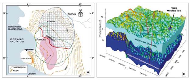 Con la finalidad de ejemplificar las características y profundidades habituales de explotación del recurso hídrico, Galecio-Ríos (2018) realiza un estudio hidrogeológico de detalle de un sector próximo a la localidad de Piura donde describe la morfología y tipos de los distintos acuíferos que determinan niveles arenosos de la Formación Zapallal (Figura 6).