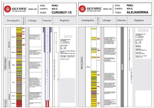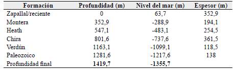 El pozo Curumuy 1X alcanzó una profundidad final de 1419,7 m (Tabla 3) donde penetró el basamento del Grupo Amotape. De este modo, el pozo atravesó todas las formaciones cenozoicas reconocidas en la cuenca Sechura (Tabla 3).