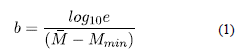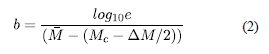 Donde es la magnitud promedio y Mm¡n es la magnitud mínima de una muestra de datos, que puede expresarse en función de la magnitud de completitud, Mc. Así mismo, Bender (1983) y Utsu (1999), entre otros, establecieron un AMcorrespondiente a un "bin" o rango de magnitudes agrupadas o acumuladas, que por lo general tiene un valor de 0,1, modificando la fórmula de Aki (1965) y Utsu (1965) así: