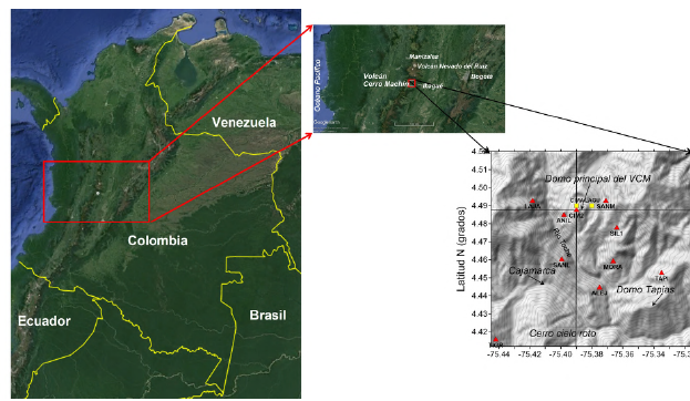 El VCM localizado en la cordillera Central de Colombia (Figura 1) es catalogado como uno de los volcanes más explosivos del país (Cepeda y Murcia, 2000). Se han podido identificar al menos seis erupciones importantes en los últimos 5000 años, la última hace 900 años (Rueda et al., 2005). El monitoreo continuo del VCM se inició en 1989, y posteriormente en 2004 se diversificó la red de monitoreo, con diferentes estaciones instaladas en campo, que cubren disciplinas como sismología, geodesia, geoquímica y geofísica de campos potenciales.