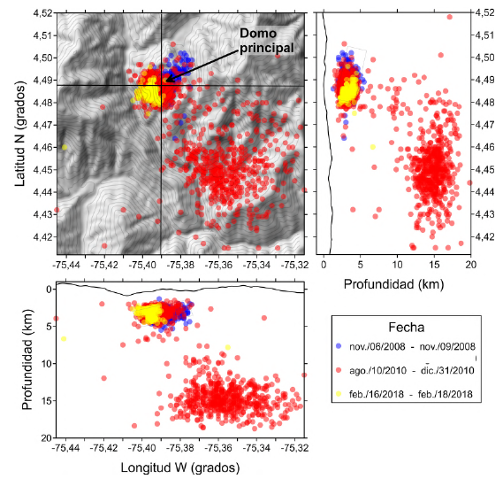Entre 2008 y principios de 2013, el volcán mostró la mayor actividad sísmica registrada hasta la fecha en términos de energía y número de sismos; se destaca el enjambre sísmico ocurrido en noviembre de 2008 hacia el NE y E del domo principal (INGEOMINAS, 2008), en el cual se registró el sismo de mayor magnitud observado hasta la fecha, ocurrido el 9 de noviembre (ML 4,9, prof=3,0 km, a 1 km al E del domo principal). Así mismo, durante ese período, se registró sismicidad distal (4-10 km) hacia el SE del domo principal, particularmente entre 2010 y principios de 2013 (julio 2010 a abril de 2011 y octubre 2012 a febrero de 2013), con profundidades entre 9 y 18 km, la cual no se había registrado anteriormente.
