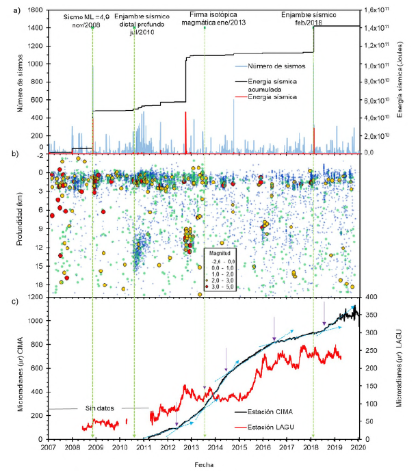 En febrero de 2018, ocurrió un enjambre sísmico hacia el SW del domo principal, entre 3 y 5 km de profundidad, con el mayor número de sismos diarios registrado hasta la fecha, aunque no tan energéticos como en el período 2008-2012. La sismicidad de tipo volcano-tectónica, asociada con fracturamiento y agrietamiento de las rocas al interior del volcán, es la que predomina en el VCM (Figura 2), aunque en el período 2018-2019 se han registrado unas pocas señales sísmicas que podrían estar asociadas a actividad de fluidos dentro del volcán.