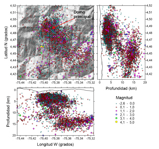 Así mismo, se detectaron cambios geoquímicos antes del enjambre (INGEOMINAS, 2008). Por lo tanto, es posible suponer que este primer cambio importante del valor b estuvo asociado a una intrusión magmática, posiblemente en forma de dique o silo, sugerida además por la distribución de los hipocentros (ver más adelante).
