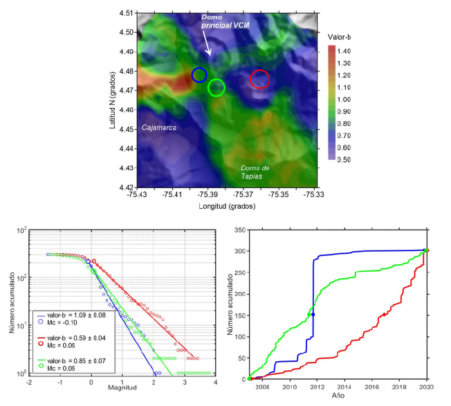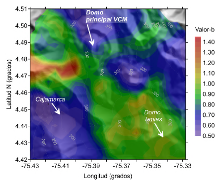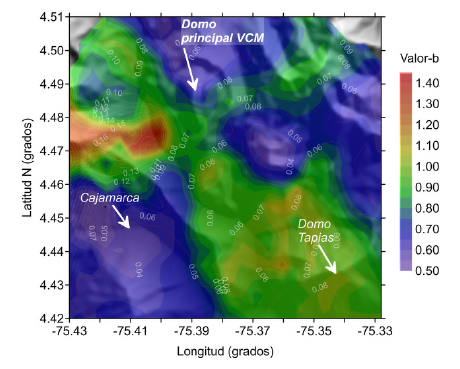 Los resultados obtenidos en este trabajo permiten concluir que el valor b en la zona del VCM ha experimentado cambios tanto espaciales como temporales en el lapso estudiado (2007-enero 2020). Estos cambios podrían obedecer a variaciones en la actividad del VCM. Las tres zonas con valores anómalos altos de b (>1,2) en profundidad, localizadas SW (-1, 1 km), debajo del domo principal (0, -1 km) y al SE del domo central (8-13 km), permiten suponer que es posible que estén asociadas a parte de la estructura interna del volcán y sus alrededores (Figura 8). La zona al SW más superficial podría estar asociada con material fluido y caliente, posiblemente perteneciente al sistema hidrotermal del VCM, y que es en parte responsable de la actividad fumarólica y de fuentes termales con relativa alta temperatura que se encuentran en cercanías del domo central (Inguaggiato et al., 2017). Por su parte, la zona anómala al SE, más profunda, podría estar relacionada con parte de uno de los reservorios magmáticos del VCM. La zona anómala debajo del domo central se podría relacionar con parte del sistema magmàtico superficial del VCM, posiblemente con parte de la estructura interna del domo central. Londoño (2012) realizó una tomografia sísmica 3D de velocidad para el VCM y definió una zona de baja velocidad entre 10 y 12 km de profundidad, coincidente con la zona anómala de valores de b hacia el SE del VCM, en cercanías al domo Tapias.