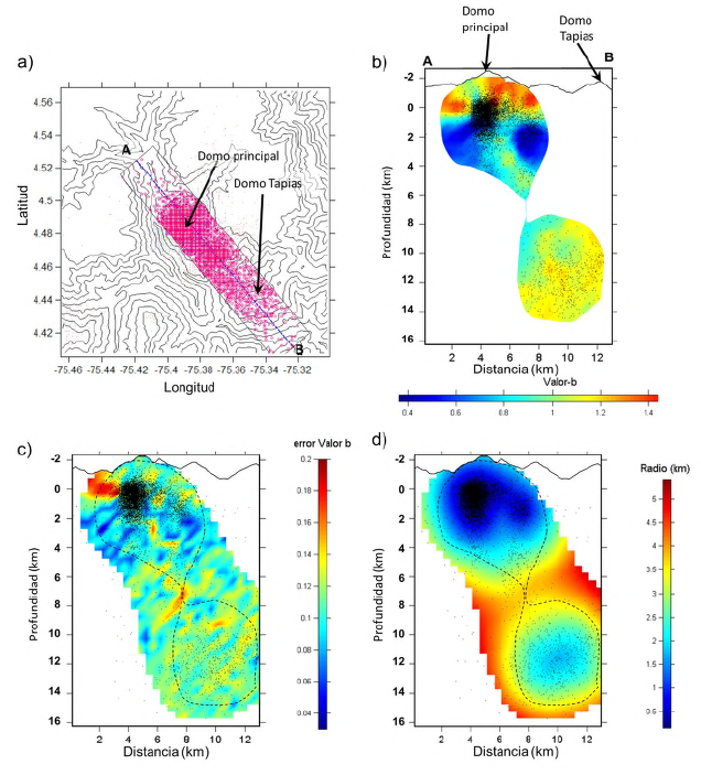 Adicionalmente, se pudieron identificar dos zonas con valores anómalos altos del valor b (>1,2) hacia el SW del domo principal, entre -1 y 1 km de profundidad, y en la parte SE distal del domo principal, en cercanías al domo de Tapias, entre 8 y 13 km de profundidad, las cuales pueden estar asociadas, la primera, con la presencia de fluidos hidrotermales y, la segunda, con un reservorio de magma.
