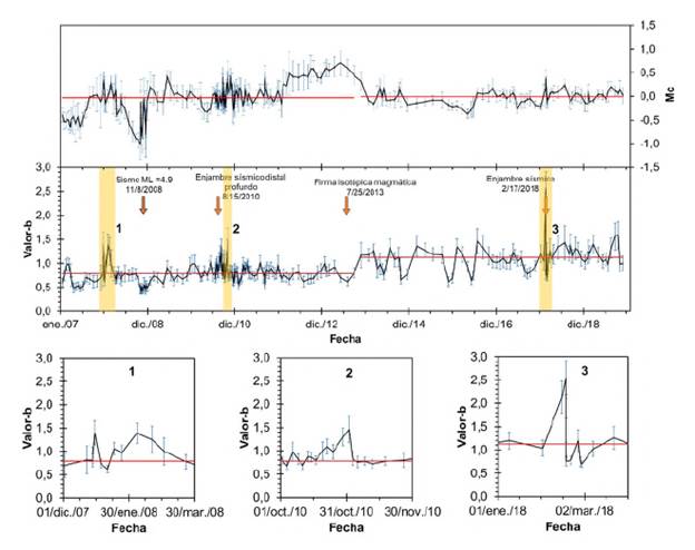 La Figura 9 muestra la variación temporal de la magnitud de completitud (Mc) y del valor en el VCM entre 2007 y principios de 2020. Mc, en general, varió entre -1 y 0,7, con promedio cercano a cero. Se puede observar también que el valor b presentó cambios temporales; en particular, tres cambios importantes se pudieron detectar. El primero (1 en Figura 9), en el período diciembre 2007 a febrero de 2008, que varió de 0,8 antes de ese período hasta 1,4 durante ese período, luego descendió hasta 0,55 antes del sismo de ML 4,9 el 9 de noviembre de 2008. El segundo (2 en Figura 9), ocurrido en el período octubre a la primera mitad de noviembre de 2010, varió de 0,8 antes de ese período a 1,5 durante ese período, justo después de la aparición de sismicidad profunda (9-18 km) localizada entre 4 y 10 km hacia el SE del domo principal. El tercero (3 en Figura 9), ocurrido en el mes de febrero de 2018, se asocia con un aumento importante de la sismicidad del VCM (Figura 2), variando los valores de b de 1,0 a finales de enero de 2017 a valores de 2,5 a mediados de febrero de 2018, luego de lo cual retornó a valores de 1,0 a finales del mismo mes. Entre noviembre de 2013 y noviembre de 2017, el valor b mostró inestabilidad, con una gran variación oscilatoria (0,6 a 1,5), sin mostrar una tendencia clara. Así mismo, también es posible observar en la Figura 9 que, a partir de octubre de 2013, el valor b aumentó su promedio, mientras que la Mc permaneció similar, por lo que es posible separar en dos grandes períodos los valores de b en el VCM para la ventana de tiempo analizada: entre enero de 2007 y septiembre de 2013, y entre octubre de 2013 y enero de 2020.