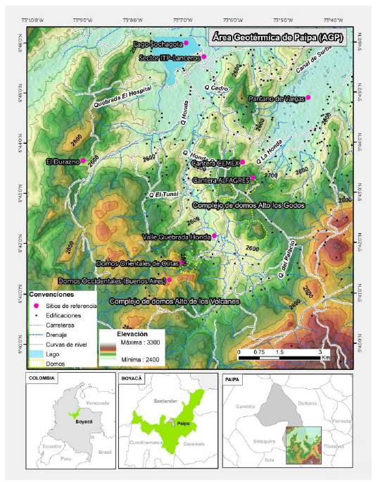 El Área Geotérmica de Paipa (AGP) (Figura 1) está localizada en la cordillera Oriental, en el departamento de Boyacá, al sur del municipio que la denomina, y a 180 km de la ciudad de Bogotá; geográficamente, se delimita al sur por el anticlinal Tibasosa-Toledo, al norte por el río Chicamocha, al oriente por la elevación del Alto de los Godos y el Pantano de Vargas y al occidente por el Alto de El Durazno (Alfaro et al., 2017; Rueda-Gutiérrez, 2020). El AGP se encuentra en el ambiente compresivo de la cordillera Oriental y está controlada estructuralmente por las fallas de Boyacá y Soápaga, en un contexto principalmente sedimentario. Sin embargo, existen productos volcánicos asociados a un vulcanismo en el Pleistoceno, diferente al asociado a los sistemas geotérmicos al sur de las cordilleras Central y Occidental (Velandia, 2003; Cepeda y Pardo, 2004; Bernet et al., 2016) (Figura 2).